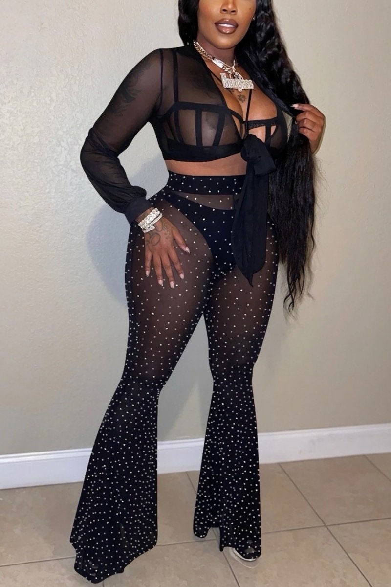 Autumn mesh patchwork see-through rhinestone high quality sexy pants two piece set (with panties)