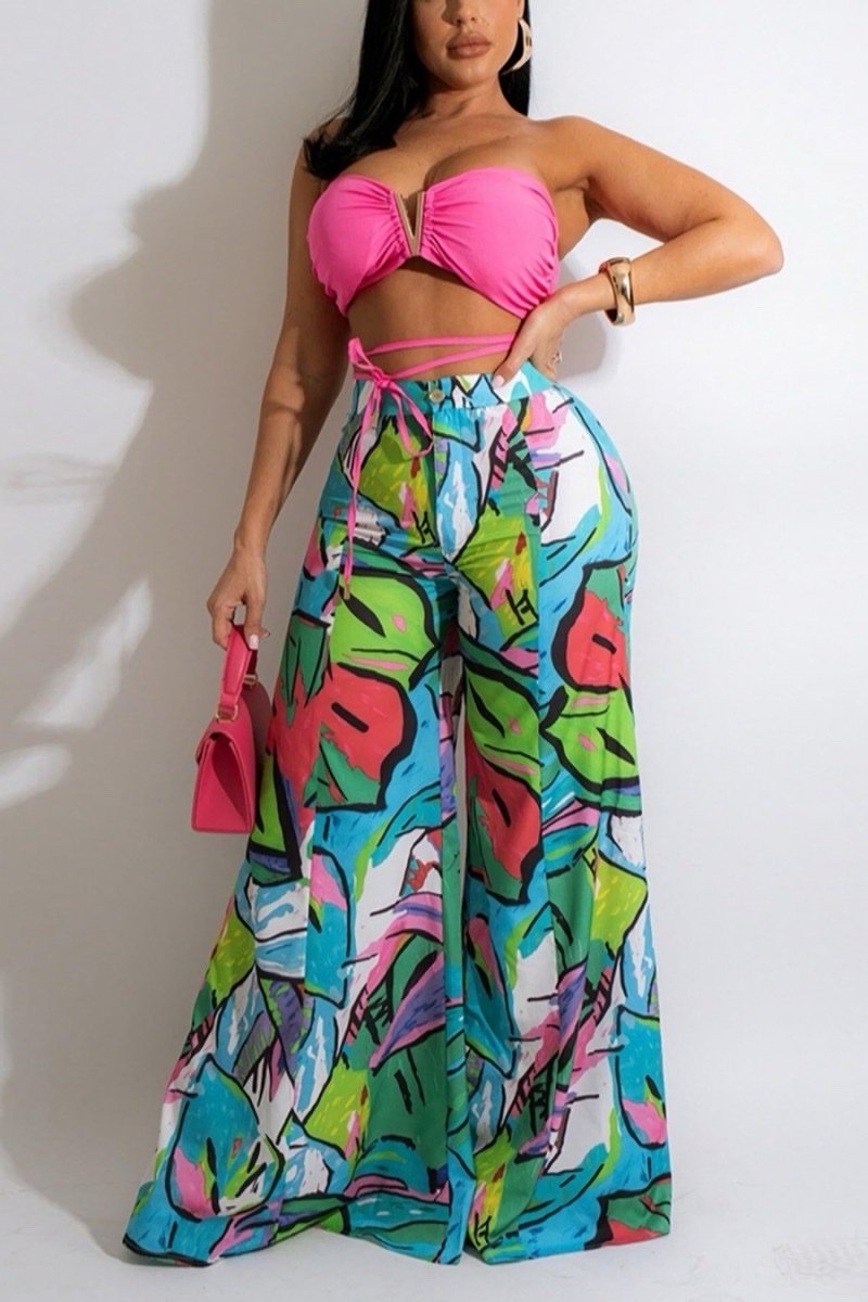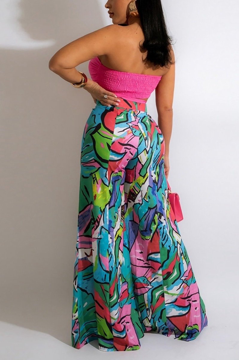 Batch printing stretch lace-up smocked tube top with wide-leg button zip-up pants stylish two-piece set